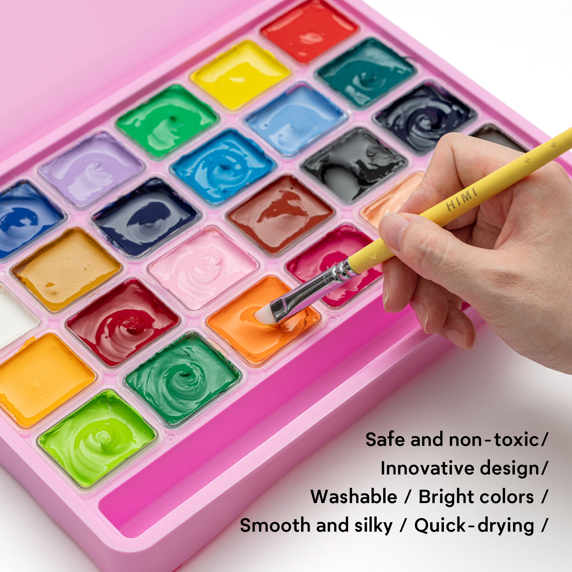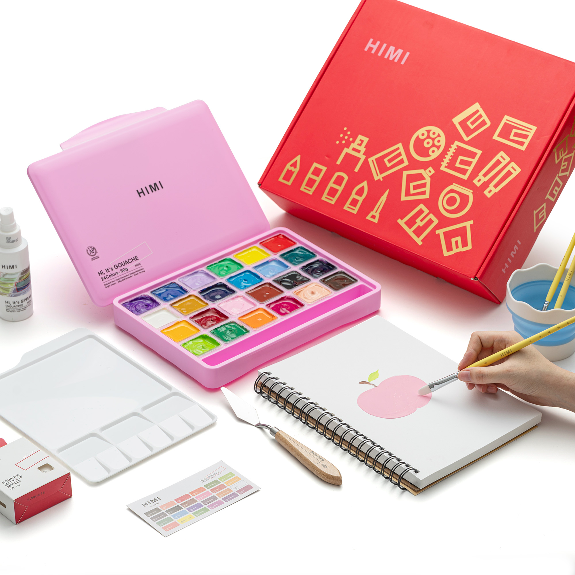 Complete Art Gift Set – includes 1 gouache pad, 1 moisturizing spray, 1 palette, 3 paint brushes, 1 painting knife, 1 foldable water bucket, and 4 jelly cup refills.