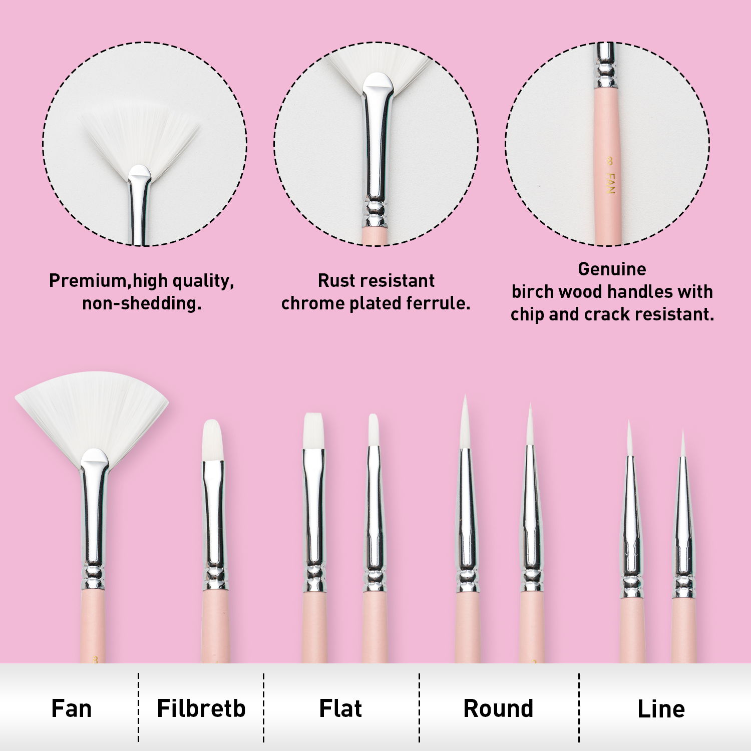 ·Set includes 1* fan, 1* filbret, 2* flat, 2* round and 2* liner brushes